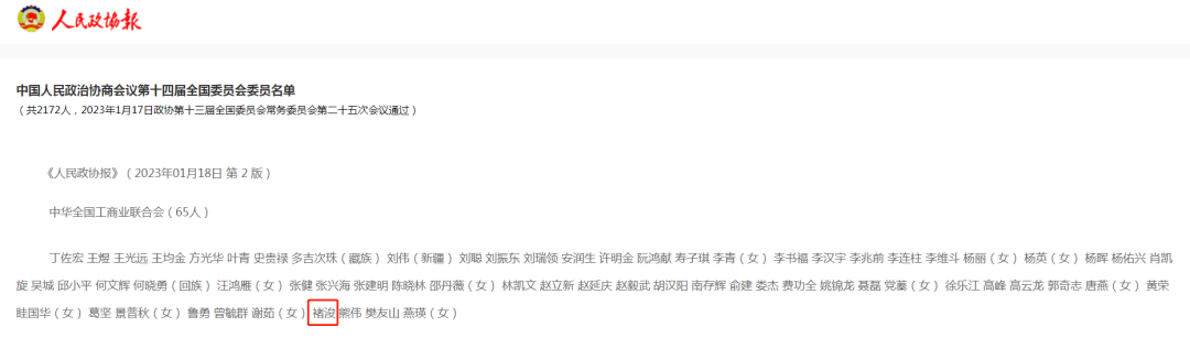 會議經過表決,通過了政協第十四屆全國委員會參加單位、委員名額和委員人選名單?;蜕匣投麻L褚浚作為中華全國工商業聯合會代表榮譽當選中國人民政治協商會議第十四屆全國委員會委員。