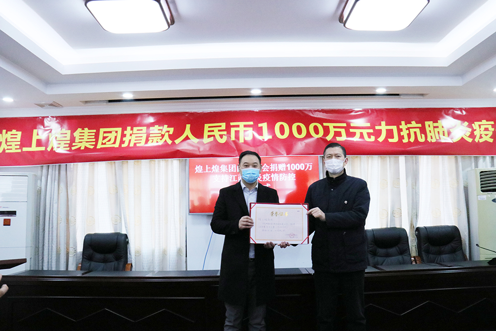 當天上午,煌上煌集團捐款人民幣1000萬力抗肺炎疫情捐贈儀式在江西省紅十字會舉行。集團黨委副書記、股份公司副董事長兼副總經理褚劍代表公司向省紅十字會黨組書記、常務副會長周海濤遞捐贈牌,省紅十字會向煌上煌集團頒發捐款證書,據了解,這是目前為止我省接到的最大一筆捐款,將全部專項用于購置醫用防護服、醫用外科口罩、一次性手術服、防護臉罩、護目鏡等急需醫療物資、醫療器具及醫療設施建設。