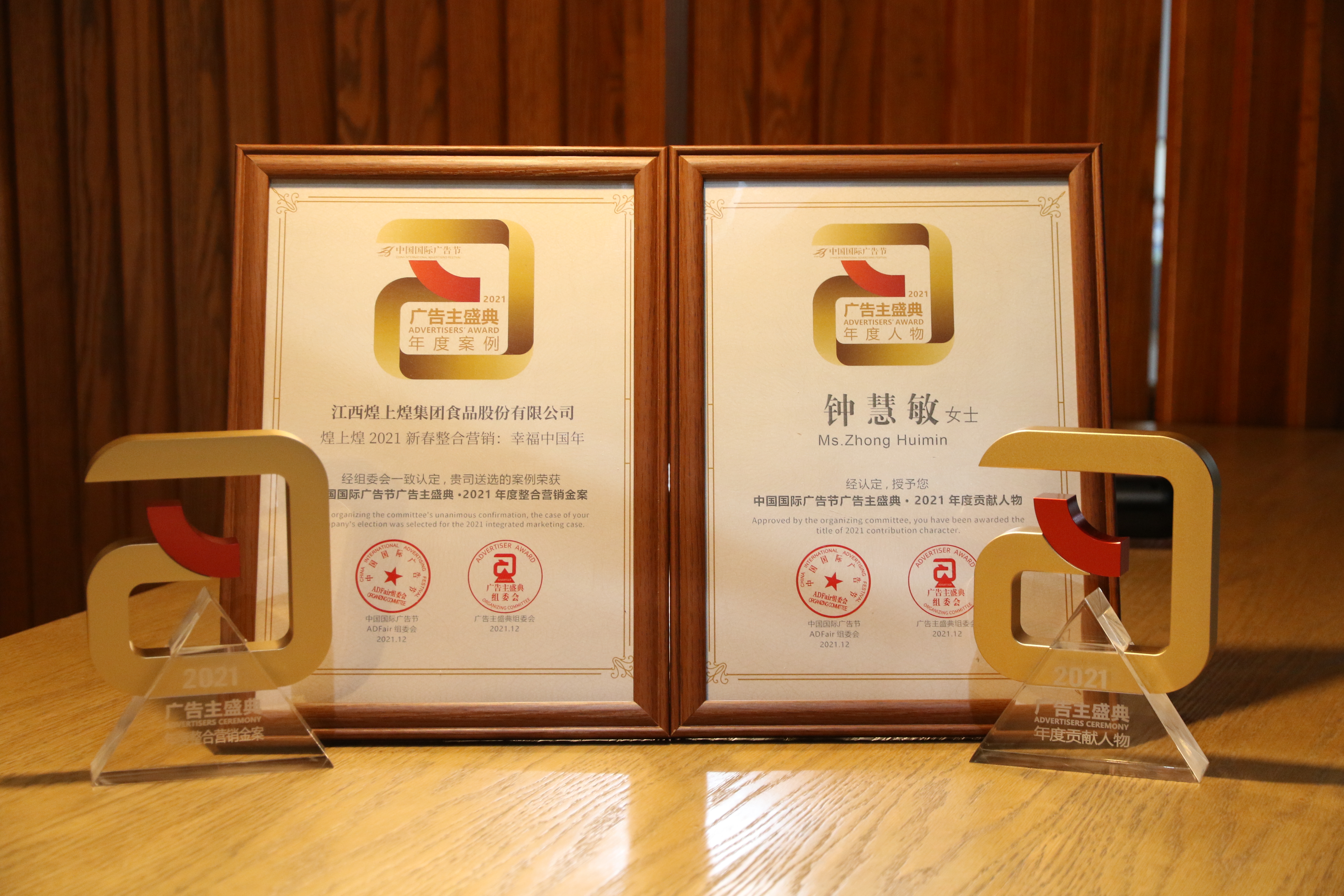 在如此激烈角逐之下,煌上煌《2021新春互動營銷:幸福中國年》 憑借消費者探知、體驗與互動、多渠道整合等方面的突出表現,最終斬獲“2021年度整合營銷金案”獎?;蜕匣托旅襟w經理鐘慧敏女士同時被組委會認定并頒發“中國國際廣告節廣告主獎·2021年度貢獻人物”獎。